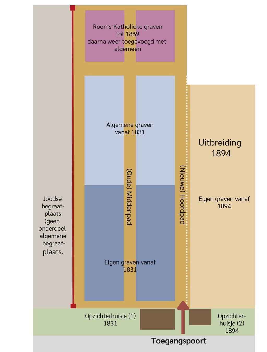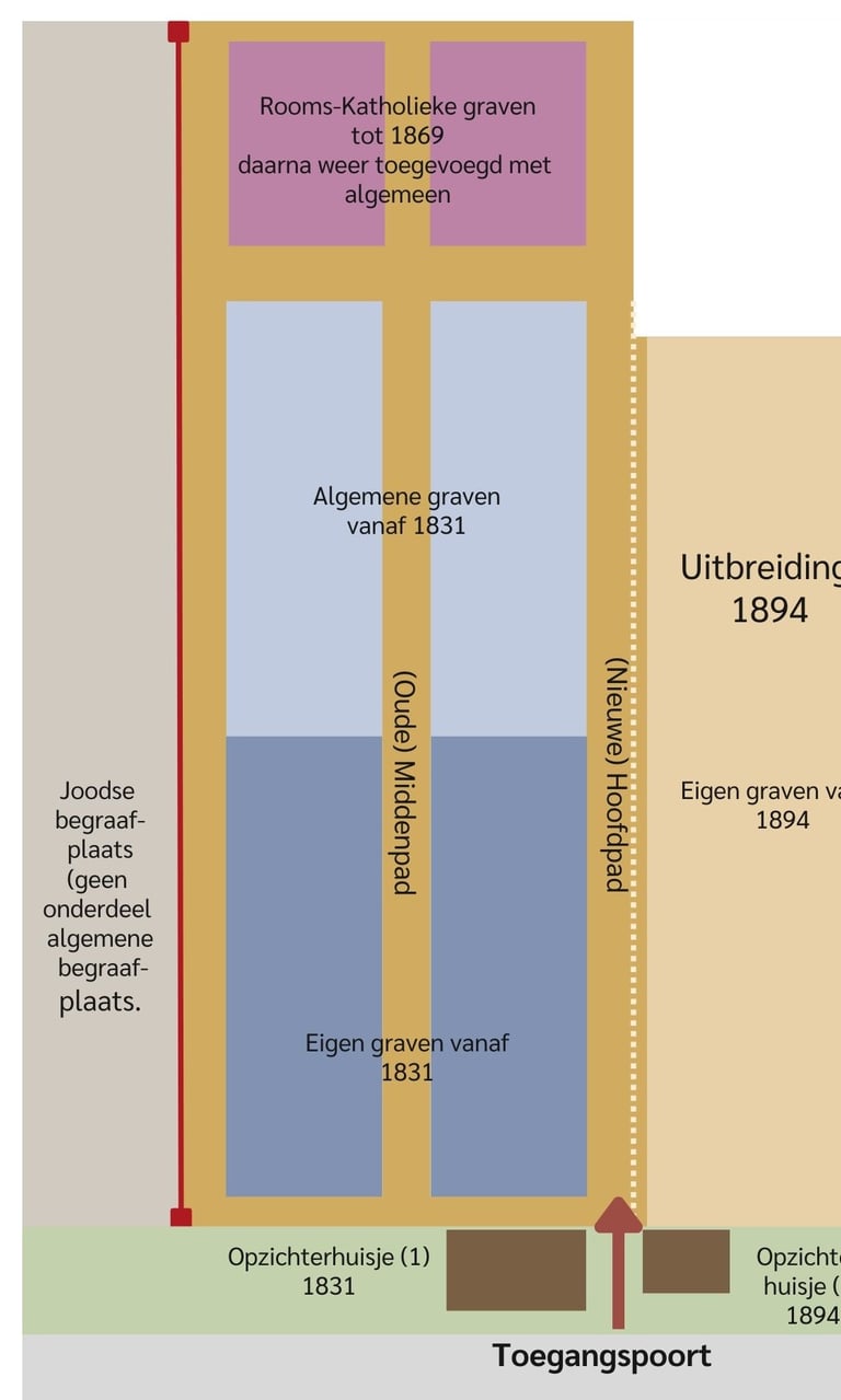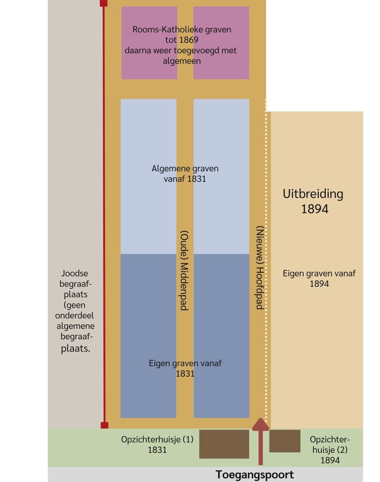 Het huidige hoofdpad tussen de twee begraafplaatswoningen achter het gietijzeren hek was bij de eerste aanleg van de begraafplaats de buitenzijde van het oudste grafveld. Langs dit huidige hoofdpad is de nummering van de graven op de granieten grafnummerstenen heel duidelijk te zien. De indeling van de begraafplaats is uiterst simpel. Een middenpad vanaf het toegangshek deelt de begraafplaats in twee helften. Aan de linkerkant (nummers 1 tot en met 3100) ligt het oudste gedeelte, het rechterdeel (vanaf nummer 3101) is in 1894 aangelegd.