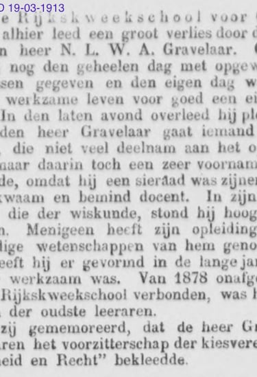"Nicolaas Lambertus Willem Anthonie Gravelaar (geboren in 1851) haalde na een opleiding op de Groningse Rijkskweekschool de onderwijzersakte en volgde daarna de geijkte weg omhoog: een lagere akte wiskunde en Duits, een middelbare akte wiskunde, en in hetzelfde jaar ook nog evende hoofdakte. In 1878, nog ruim voor zijn dertigste, lukte het hem om als wiskundeleraar benoemd te worden aan de net opgerichte Rijkskweekschool van Deventer. Al het jaar erop publiceerde hij ook zijn eerste schoolboek, Theoretische Rekenkunde, dat decennialang herdrukt zou worden. Andere reken- en wiskundeboeken volgden, culminerend in een wetenschappelijke verhandeling over het totale wiskundige werk van de beroemde Schotse wiskundige John Napier (1550-1617). Desondanks zou de geboren Groninger nooit meer uit Deventer weggaan, al gaf hij incidenteel ook elders les.” 1)