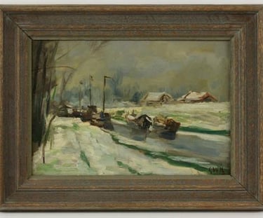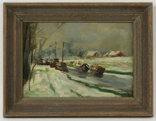 Schepen op het Overijssels kanaal, van Gerhard (de kleinzoon) . HM Deventer Zijn laatste schilderij.