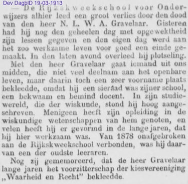 "Nicolaas Lambertus Willem Anthonie Gravelaar (geboren in 1851) haalde na een opleiding op de Groningse Rijkskweekschool de onderwijzersakte en volgde daarna de geijkte weg omhoog: een lagere akte wiskunde en Duits, een middelbare akte wiskunde, en in hetzelfde jaar ook nog evende hoofdakte. In 1878, nog ruim voor zijn dertigste, lukte het hem om als wiskundeleraar benoemd te worden aan de net opgerichte Rijkskweekschool van Deventer. Al het jaar erop publiceerde hij ook zijn eerste schoolboek, Theoretische Rekenkunde, dat decennialang herdrukt zou worden. Andere reken- en wiskundeboeken volgden, culminerend in een wetenschappelijke verhandeling over het totale wiskundige werk van de beroemde Schotse wiskundige John Napier (1550-1617). Desondanks zou de geboren Groninger nooit meer uit Deventer weggaan, al gaf hij incidenteel ook elders les.” 1)