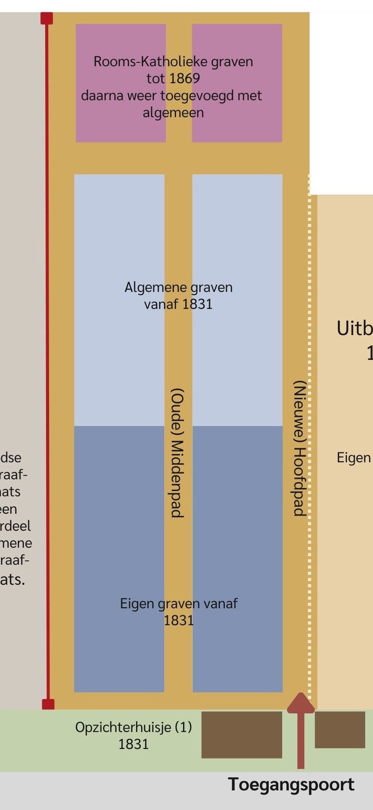 Opvallend is de eenvoud van ontwerp en aanleg van de begraafplaats. Tot de eeuwwisseling lag de grens van de begraafplaats bij het (nieuwe) hoofdpad achter de ingangspoort. Het oude middenpad van de eerste aanleg liep vanaf het toenmalige toegangshek naar achteren en verdeelde de begraafplaats in twee gelijke delen. Een dwarspad achterin vormde de scheiding met het R.K.-gedeelte van de begraafplaats (in gebruik tot 1869 wanneer de R.K.-begraafplaats aan de Ceintuurbaan in gebruik komt).