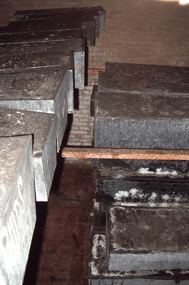 De geordende kisten in de grafkelder. Op het kinderkistje links staan op het hoofdeinde de initialen B IJ D S 1851. Het gaat hier om Barthold Jan IJssel de Schepper, op 1-jarige leeftijd overleden en bijgezet op 31 oktober 1851.